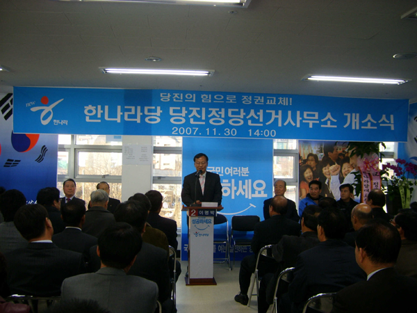 작년 2006년 12월 전임 당협위원장의 궐위이후 10개월만에 새로 임명된 김용기 조직위원장을 주축으로 당진군에서 이명박 한나라당 대통령 후보의 대선 승리를 위한 본격적인 선거운동의 시작이라 할 수 있는 명일의 선거연락소 개소식에는 김용환 상임고문, 유한열 상임고문, 강창희 중앙선대위 부위원장, 김학원 최고위원, 이진구 도당위원장, 김현욱 전 국회의원을 비롯한 300여명의 중앙과 충청권의 주요 당직자들이 참석하여 한나라당 당진군 당원들의 결속과 대선승리의 결의를 다지는 시간이 될 것이다.