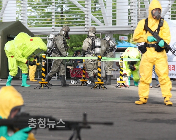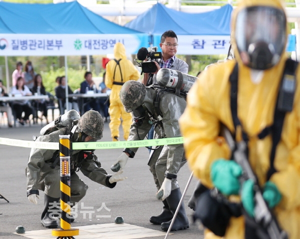 훈련은 엑스포시민광장에 탄저균으로 의심되는 백색 가루를 이용한 생물테러 발생을 가정해 진행됐다.