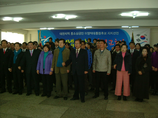대전 지역 중·소상공인은 5일 오후2시 한나라당 대전시당3층 강당에서 강창희 중앙당 인재영입위원장 겸 중앙선대위 부위원장을 비롯해 남경필 경기도당위원장, 이재선·김칠환·김공자 한나라당 대전선대위 공동위원장이 참석한 가운데 한나라당 이명박 대통령 후보에 대해 지지를 선언했다.