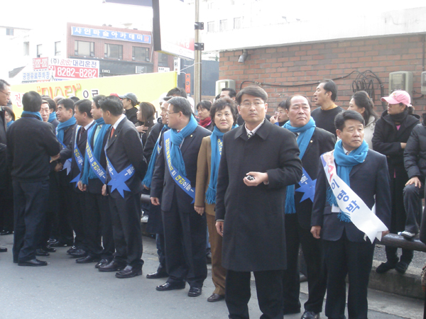 정몽준 공동 선대위원장은 "이렇게 하는 이 분들에게 점잖게 야단칠 분들은 충청도 어르신들뿐이다. 충청도 어르신들이 나라 중심을 잡아주길 부탁한다"면서 이명박 후보 지지를 호소했다.