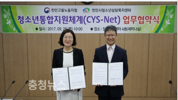 충남 천안시가 설치하고 백석대학교에서 수탁 운영하는 청소년상담복지센터(센터장 최완열)는 지난 28일 천안고용노동지청 고용복지플러스센터와 위기 청소년 지원을 위한 업무협약을 체결했다.
