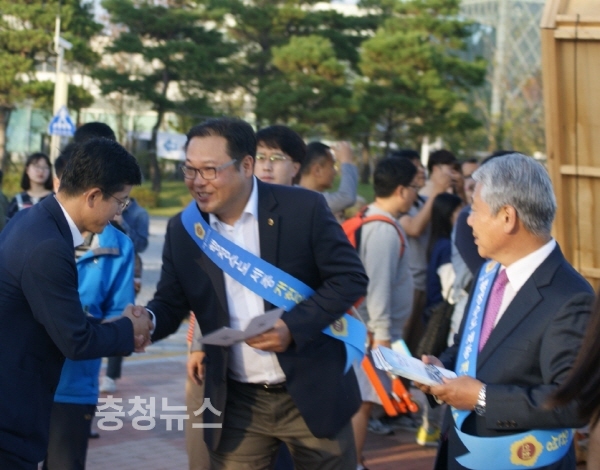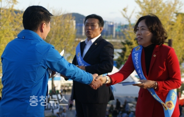 이날 김복렬, 서금택, 안찬영, 이충열, 정준이 의원들은 다섯 번째 세종축제에 참석한 관람객들을 상대로 ‘행정수도 세종 개헌으로 완성’ 어깨띠를 두루고 세종시 행정수도 완성을 위한 개헌의 필요성을 홍보했다.