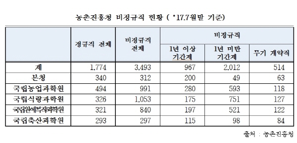 국회 농림축산식품해양수산위원회 소속 박완주 의원(더불어민주당·충남 천안을)이 농촌진흥청으로부터 제출받은 자료에 따르면 농진청 전체 직원 5,267명 중 정규직은 33.6%인 1,774명에 불과하고 나머지 3,493명이 모두 비정규직인 것으로 드러났다.
