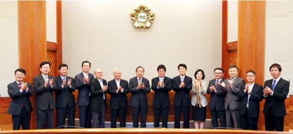 새 휘장 제막식을 마치고 김이수 헌법재판소장 권한대행(가운데)과 재판관, 사무처장, 사무차장 등과 함께 이를 축하하고 있는 모습.. (왼쪽에서 네 번째부터 김헌정 헌법재판소 사무차장, 안창호 재판관, 김창종 재판관, 김이수 헌법재판소장 권한대행, 서기석 재판관, 김용헌 헌법재판소 사무처장)