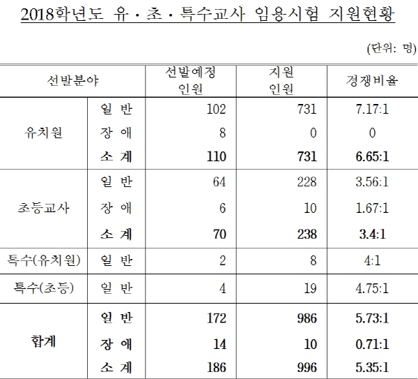 선발 분야별 경쟁률은 유치원 부문은 110명 선발예정에 731명이 원서를 접수해 6.65대 1을 보였고, 초등 부문은 70명 선발예정에 238명이 원서를 접수해 3.4대 1, 특수학교 유치원 부문은 2명 선발예정에 8명이 원서를 접수해 4대 1, 특수학교 초등 부문은 4명 선발예정에 19명이 원서를 접수해 4.75대 1의 경쟁률을 보였다.