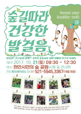 충남 천안시 서북구보건소는 이달 21일 서북구 번영로에 위치한 천안 시민의 숲에서 가족·이웃이 함께하는 ‘제4회 숲길 따라 건강한 발걸음’행사를 개최한다.