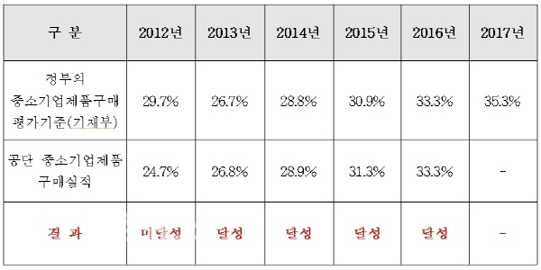 아울러 "정부의 중소기업제품구매 평가기준(표 참조) 목표치를 2013년부터 매년 높혀가며, 이를 4년동안 초과 달성하는 등 중소기업제품 구매촉진에 최선"을 다하고 있는 것으로 나타났다.