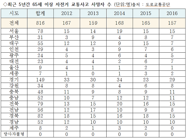 연도별 전체 자전거 교통사고 사망자수는 2012년 289명, 2013년 282명, 2014명 283명, 2015년 276명, 2016년 258명으로 점차 줄어들고 있다. 반면 고령자 사망자는 2012년 167명(57.7%), 2013년 159명(56.3%), 2014년 168명(59.3%), 2015년 165명(59.7%), 2016년 157명(60.8%) 등으로 전체 사망자 가운데 차지하는 비율이 오히려 늘고 있다.