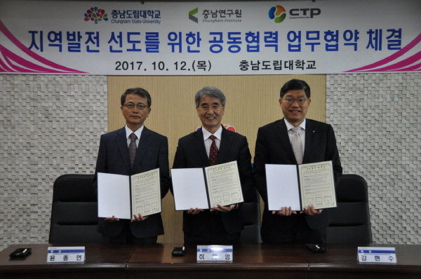 충남도립대학교(총장 허재영)는 12일 대학 대회의실에서 충남연구원 및 (재)충남테크노파크와 지역 발전을 선도할 인재를 양성을 위한 공동협력 업무협약을 체결했다.