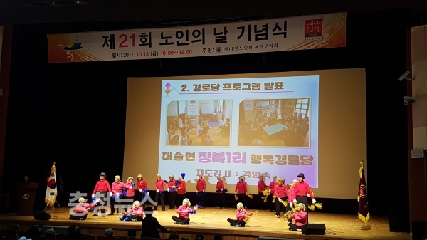 2부에서는 경로당 운영사례 및 프로그램 발표에서는 모범경로당으로 선정된 예산읍 창소3리 경로당이 운영사례를 발표한 후 대흥면 손지2리 경로당, 대술면, 신암면, 신양면 행복경로당이 난타, 건강체조 등 행복경로당 프로그램을 발표했다.