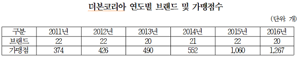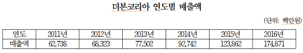 16일 국회 산업통상자원중소벤처기업위원회 소속 국민의당 이찬열 의원이 중소벤처기업부로부터 제출받은 자료에 따르면, 더본코리아는 2016년 약 1749억 원의 매출을 달성했다. 2015년 약 1239억 원에 비해 무려 510억원 (41.2%)가 증가했으며 가맹점수도 2011년 374개에서 지난해 1267개로 급격히 확대되고 있다.