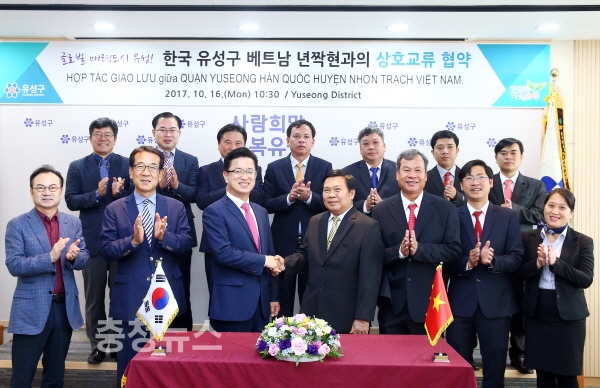 대전 유성구(구청장 허태정)는 16일 구청 중회의실에서 동남아시아 신흥 잠룡 베트남 동나이성 년짝현(현장 레만융)과 상호교류 MOU를 체결했다.