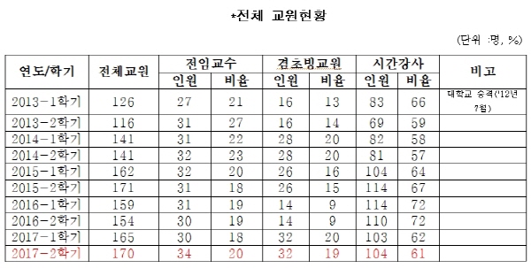 시간강사의 높은 비중도 문제로 드러났다. 전체교원 170명 중 전임교원 34명, 20%에 불과했으며 시간강사 및 겸초빙교원은 무려 124명, 80%에 달했다.