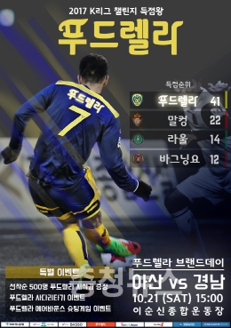 정규시즌 마지막 홈경기를 맞아 아산의 클래식 승격을 응원하러 온 팬들을 위해 선착순 500명에게 푸드트럭에서 조리된 ‘푸드렐라’ 제품의 시식권이 증정될 예정이며, 푸드트럭 근처에는 에어바운스가 설치, 슛팅 게임을 통한 ‘푸드렐라’ 경품이 지급 된다.