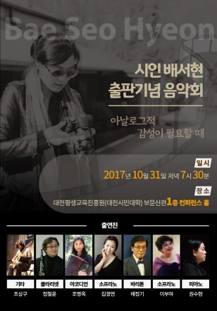 배 시인은 오는 31일 저녁, 대전시민대학 보문산관 1층 컨퍼런스홀에서 음악회를 열고 자신의 시 낭송은 물론 다양한 공연을 통해 가을밤의 분위기를 채울 예정이다.