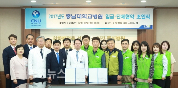 충남대학교병원(원장 송민호)은 지난 16일 행정동 3층 세미나실에서 송민호 원장과 최재홍 충남대학교병원 노동조합 지부장, 최권종 전국보건의료산업노동조합 수석부위원장, 김성남 전국보건의료산업노동조합 대전·충남지역 본부장 등 노·사 교섭위원들이 참석한 가운데 ‘2017년도 임금·단체협약 조인식’을 진행했다.