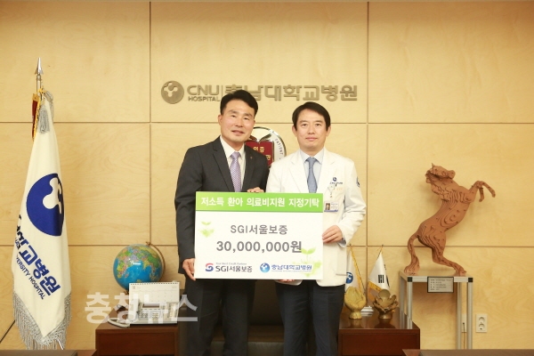 충남대학교병원(병원장 송민호)은 SGI서울보증(대표이사 김상택)이 저소득 환아 의료비 지원금 3천만원을 기부했다고 17일 밝혔다.