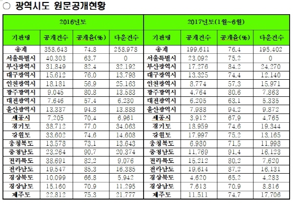 소병훈 더불어민주당 의원(경기 광주갑)이 행정안전부로부터 제출받은 2017년도 6월 말 광역시도 원문정보공개현황을 보면, 공개건수 199,611건에 평균 76.4%로 집계됐다.