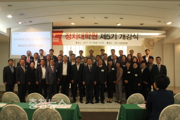 자유한국당 충남도당(위원장 박찬우)이 자유한국당의 이념과 가치에 공감하는 참신한 정치신인을 발굴하고 각종 공직선거 출마에 관심이 있는 예비정치인을 양성하고자, 20일부터 11월 30일까지 6주간 정치대학원 5기를 개강한다.