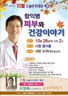 충남 천안시는 이달 26일 시청 봉서홀에서 피부과 전문의 함익병 강사를 초청해 ‘피부와 건강이야기’라는 주제로 10월 도솔아카데미 특강을 진행한다.