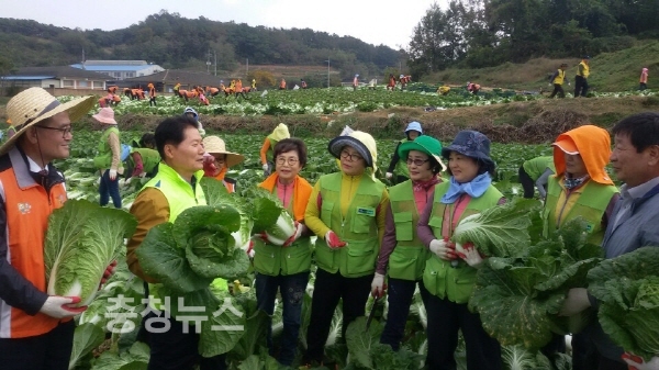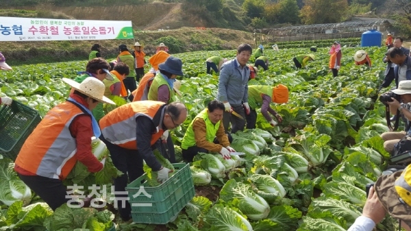 이날 일손돕기에는 김병원 농협중앙회장과 전국에서 모인 범 농협 임직원과 (사)고향을 생각하는 주부들의 모임 회원 등 320여 명이 참석해 한마음으로 가을배추 수확에 구슬땀을 흘렸다.
