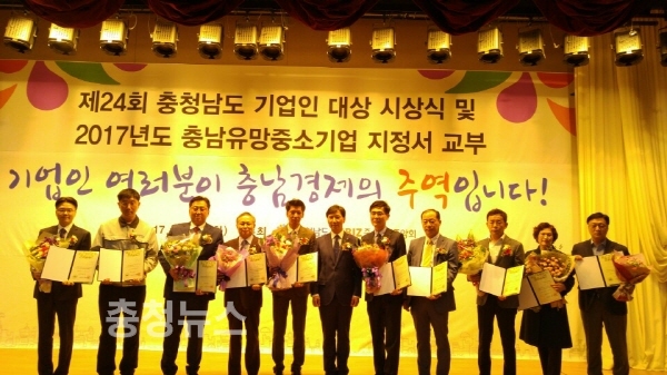 충남도는 24일 보령시 대천웨스토피아에서 개최된 ‘2017 충청남도 유망중소기업 지정서 수여식’에서 안희정 지사와 도내 기업인, 근로자 등 200여 명이 참가한 가운데 올해의 유망 중소기업 10개 기업을 선정해 지정서와 현판을 수여했다.