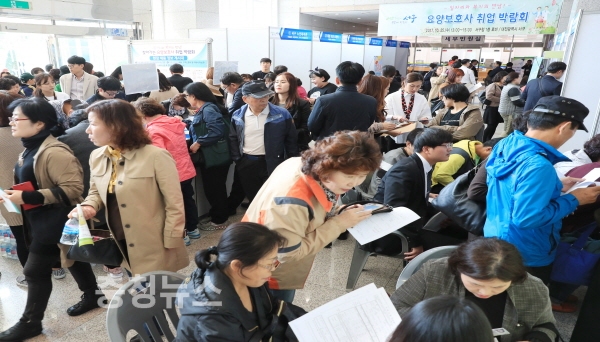 대전 서구(구청장 장종태)가 지난 25일 구청 로비에서 개최한 ‘요양보호사 취업박람회’에 700여 명의 구직자가 몰려 뜨거운 열기를 보였다.