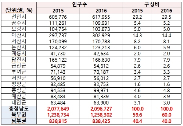 충남도 서북부 지역만 인구증가?