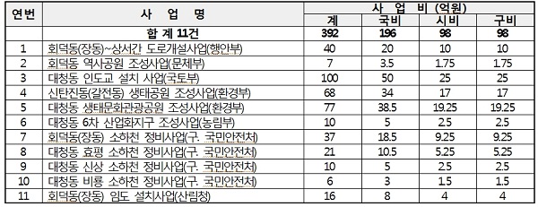 이번에 반영된 사업은 장동-상서 간도로개설사업을 비롯해 회덕동 역사공원 조성, 대청동 인도교 설치, 신탄진동(갈전동) 생태공원 및 대청동 생태문화관광공원 조성, 대청동 6차 산업화지구 조성 등이다. 또한 장동 소하천 및 대청동 효평·신상·비룡 소하천 정비, 장동 임도 설치사업 등도 포함됐다.