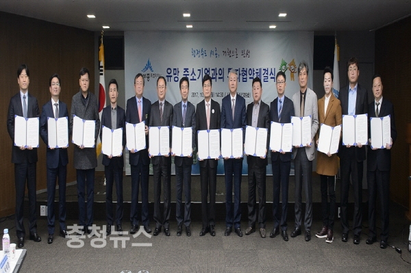 세종시(시장 이춘희)는 30일 청사 내 5층 세종실에서 유망 중소기업 14개사와 투자협약을 체결했다.