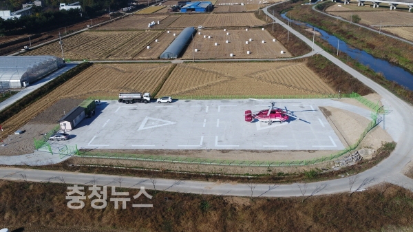 충남 홍성군은 홍성읍 내법리 234-1 일원 3,000㎡ 면적에 2억 7천만원의 사업비를 투입해 산불진화와 응급환자 이송을 위한 헬리콥터 2대가 동시에 이착륙할 수 있는 계류ㆍ착륙장을 10월 완공했다.