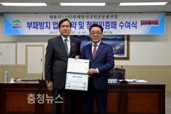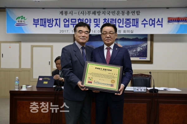 충남 계룡시(시장 최홍묵)와 국민권익위원회 소관 (사)부패방지국민운동총연합이 부패방지 및 청렴문화를 위해 손을 잡았다.