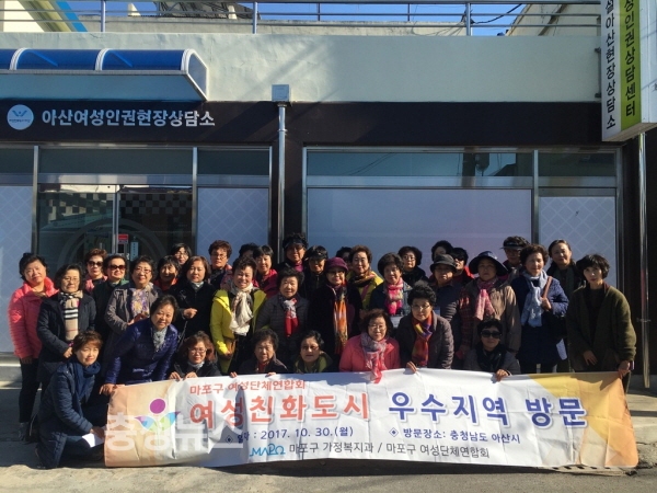 마포구 가정복지과 여성복지팀에서는 마포구 여성단체연합회 소속 단체 회원 36명과 함께 최근 여성과 노약자, 장애인들을 배려한 여성친화 건물로 신축된 아산시 배미수영장과 성매매 우려지역 기능전환을 위한 아산시의 노력으로 여성인권현장상담소 등을 운영하고 있는 장미마을 등을 둘러보고 장미마을 걷기 프로그램 등에 참여했다.