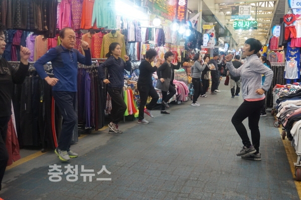 충남 논산시(시장 황명선)가 평소 건강을 챙기기 힘든 시장 상인들을 대상으로 운영하고 있는 ‘건강체조’가 호응을 얻고 있다.