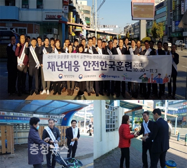 10월 30일 태안군 버스터미널 등지에서 서부발전 임직원들이안전한국훈련 및 재난발생 행동요령 리플렛 등을 시민들에게나눠주며 가두 홍보활동을 펼치고 있는 모습(아래 왼쪽 사진이서부발전 정영철 사장 직무대행, 오른쪽이 박대성 상임감사)
