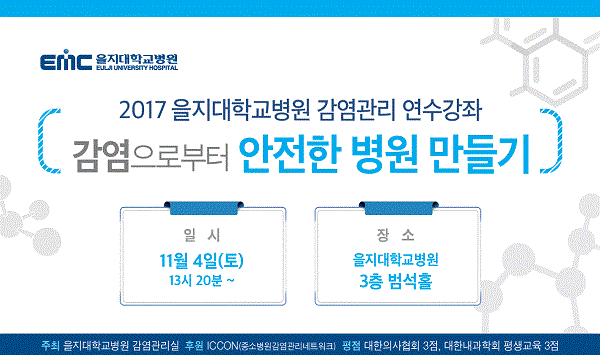 을지대학교병원(병원장 홍인표)은 4일 오후 1시 20분 병원 3층 범석홀에서 ‘2017 을지대학교병원 감염관리 연수강좌’를 개최한다.