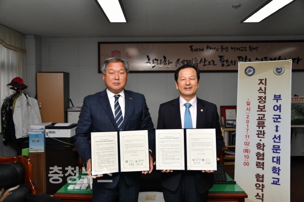 충남 부여군과 선문대학교가 2일 부여군청 군수실에서 이용우 군수와 황선조 총장 등 10여 명이 참석한 가운데 지식정보 교류를 위한 관·학 협약을 맺었다.