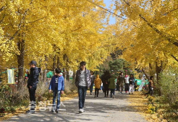 수령 100년이 넘는 토종 은행나무 30여 그루를 포함해 모두 1000여 그루 식재된 우리나라 최대 은행나무 군락지 중 하나인 청라 은행마을에서도 마을 전체가 노란 은행나무 단풍으로 황금빛 물결을 이뤄내 가을의 절정을 함께했다.