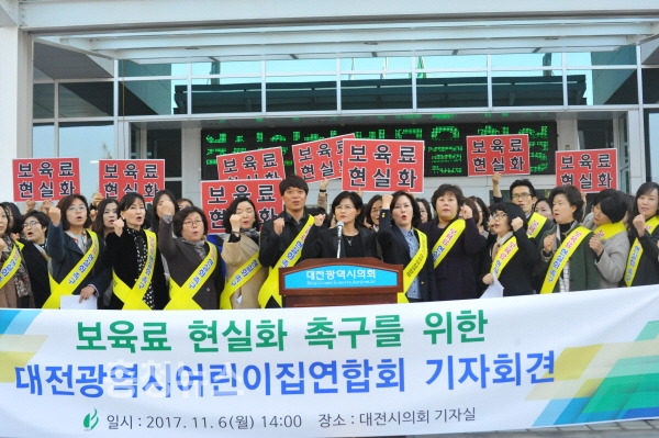 대전어린이집연합회(회장 정진숙)는 이날 대전시의회에서 기자회견을 갖고 "지난 십수년간 어린이집에서는 커피 한 잔 값도 되지 않는 1745 원으로 아이들의 한 끼 식사와 두 번의 간식을 해결할 수 밖에 없었다"며 "겨우 1745 원으로 양질의 보육서비스를 어떻게 제공할 수 있겠느냐"고 호소했다.