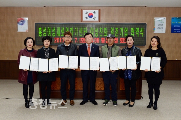 충남 홍성군은 7일 군청 회의실에서 관내 7개 기업․단체와 홍성여성새로일하기센터 여성친화 일촌기업 업무 협약식을 체결했다.
