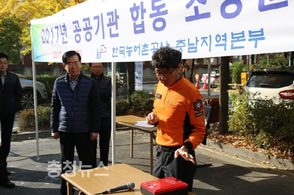 한국농어촌공사 충남지역본부(본부장 김병찬)는 7일 본부내 전직원을 대상으로 둔산119안전센터와 합동소방훈련을 실시했다.
