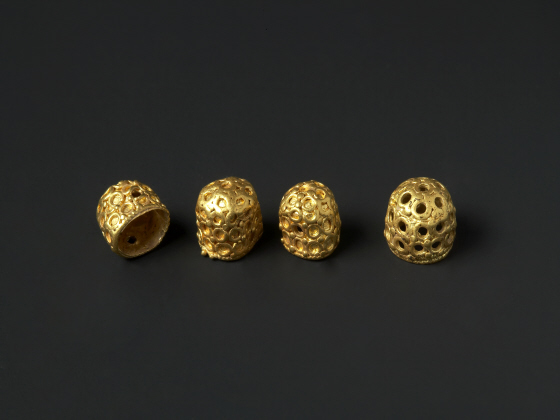 또 관모冠帽장식으로 보이는 운모로 만든 꽃잎과 철제테는 백제 복식사 연구에 귀중한 자료입니다. 한편, 쌀알보다도 작은 유리구슬과 손톱만한 금공품에 펼쳐진 정밀한 세공술細工術은 보는 이로 하여금 감탄을 자아내게한다.