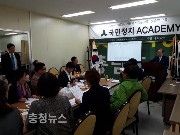 이번 국민정치아카데미에는 노명구 노동특별위원장, 주명식 천안시의원, 이태용 도당 부위원장, 김근민 당진 여성위원장, 조광국 도당부위원장, 박양애 행정특별위원장, 오동원 직능위원장, 류제국 전 천안시의원, 조성미 전 홍성 YMCA 이사장, 신순옥 여성위원장, 이순숙 한희애육원 이사, 김주영 소통리더십 특별위원장, 이만 서산 여성위원장, 박종인 전 기획위원장, 이해선 공주시의원, 윤영득 서산시의회 부의장, 이창 도당 부위원장, 박노선 보건복지위원장, 이남희 청년위원장, 주일원 천안시의원, 김보희 서산시의원, 안종혁 천안시의원, 이상구 충남장애인문화협회장, 이태구 교육혁신특별위원장, 남상균 충남도당 사무처장, 노동곤 충남도당 정책실장, 이종설 천안갑 지역위원장, 전은태 직능국장, 이정아 교육위원장, 이정원 전 천안시의회 의장 등 30명의 수강생이 참석했다.
