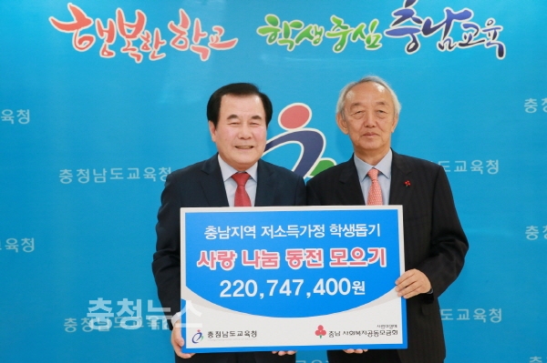 충남도교육청과 충남 사회복지공동모금회는 지난 2005년부터 저소득 가정 학생 돕기 업무제휴 협약을 맺고 ‘사랑 나눔 동전 모으기’를 비롯해 ‘사랑의 수호천사’, ‘희망나눔 캠페인’ 사업 등을 통해 매년 10억여 원의 성금을 저소득가정 학생의 생계비, 의료비, 대학입학 학자금 등으로 지원해왔다.