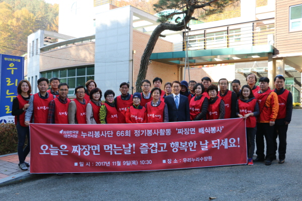 자유한국당 대전광역시당(위원장 이은권) 누리봉사단은 9일, 서구 장안동에 위치한 우리누리수양원을 방문하여 이곳에 거주하는 생활인들에게 짜장면을 직접 만들어 배식하고 식당과 강당 등 주변 환경정화 봉사활동을 펼쳤다.