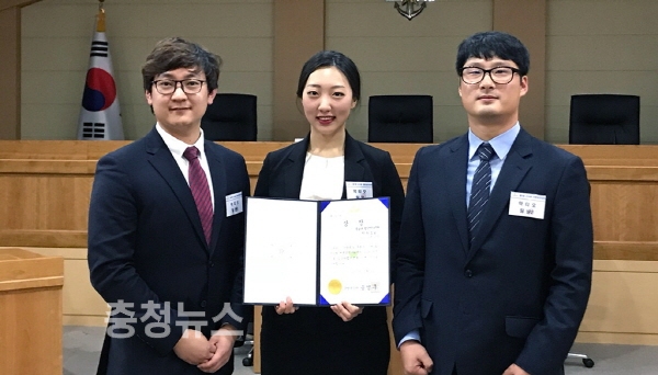 충남대 법학전문대학원 학생들(김솔, 김준영, 김진우)이 국방부 고등군사법원이 주최한 ‘제1회 군사법 변론경연대회’에서 최우수상인 국방부장관상을 수상했다.