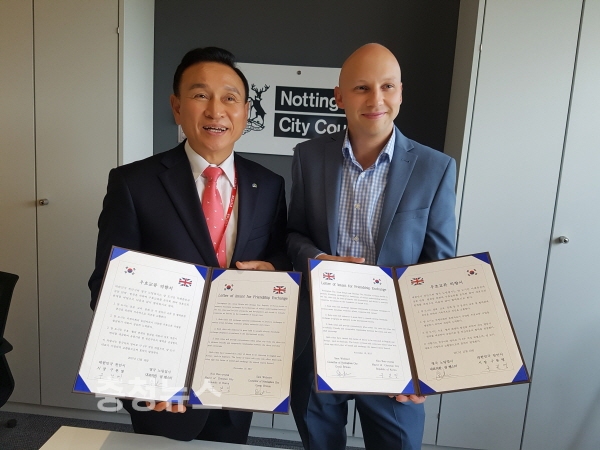충남 천안시는 영국 현지시각 지난 10일 노팅엄시청사에서 영국 노팅엄시와 국제우호협력도시 협약을 체결했다고 밝혔다.