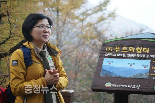 안미영 팀장과 김미선 산림치유 지도사는 "산림치유는 숲에 존재하는 다양한 환경요소를 활용하여 인체의 면역력을 높이고, 신체적 정신적 건강을 회복시키는 활동"이라고 설명했다.