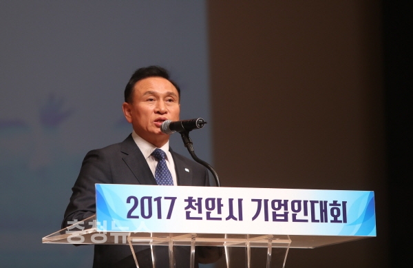 13일 제13회 천안시 기업인대회에서 구본영 시장 인사말 모습