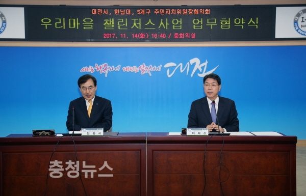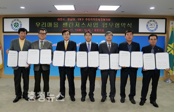 대전시(시장 권선택)와 한남대학교(총장 이덕훈), 5개구 주민자치위원장협의회는 14일 시청 중회의실에서 지역상생발전 및 주민자치 활성화를 위한 ‘우리마을 챌린저스사업 업무협약’을 체결했다.